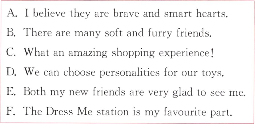 First, we go to the Choose Me station. 1.______ They are waiting to be stuffed. Among them are traditional teddy bears, puppies, kittens and cartoon characters. I choose a cream - coloured teddy bear for myself and a rainbow kitty for my sister.