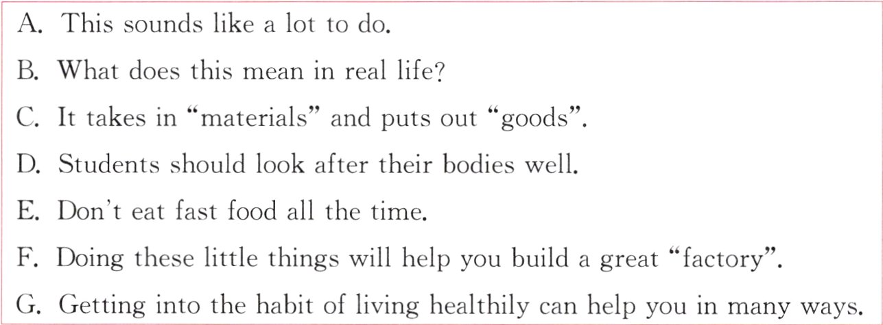 It’s good to start building a better “factory” at a young age. 3. ____ If you get enough sleep, you’ll be able to do better in your studies. Eating healthy food helps your body grow strong and fight off sickness. And exercise can help you stay healthy.