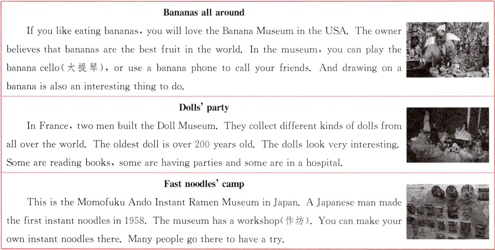 本文介绍了世界各地一些不同寻常的博物馆:美国的香蕉博物馆、法国的洋娃娃博物馆和日本的方便面博物馆。