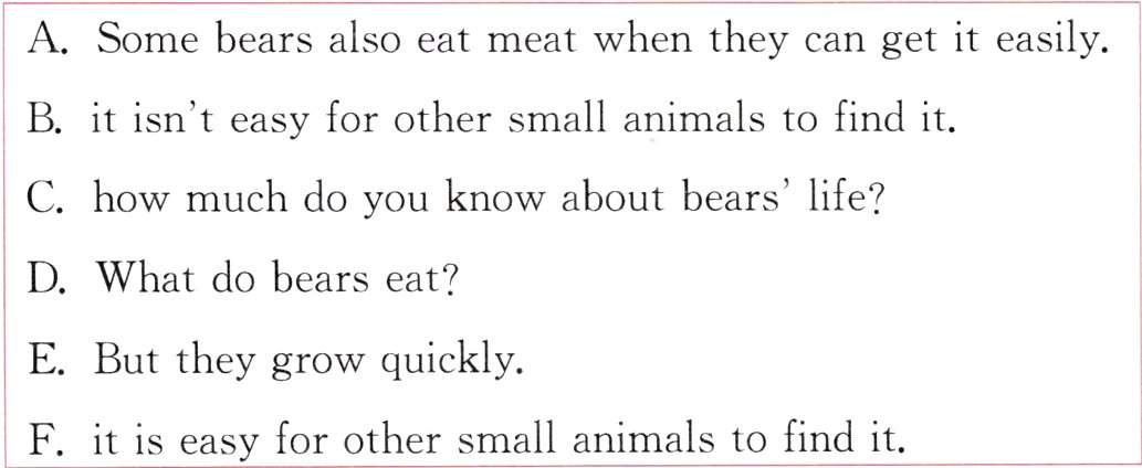 5. E 根据后句“A week later the babies can open their eyes.”理解可知,一周后宝宝们可以睁开眼睛了,说明此处应该谈论熊宝宝们生长得快。