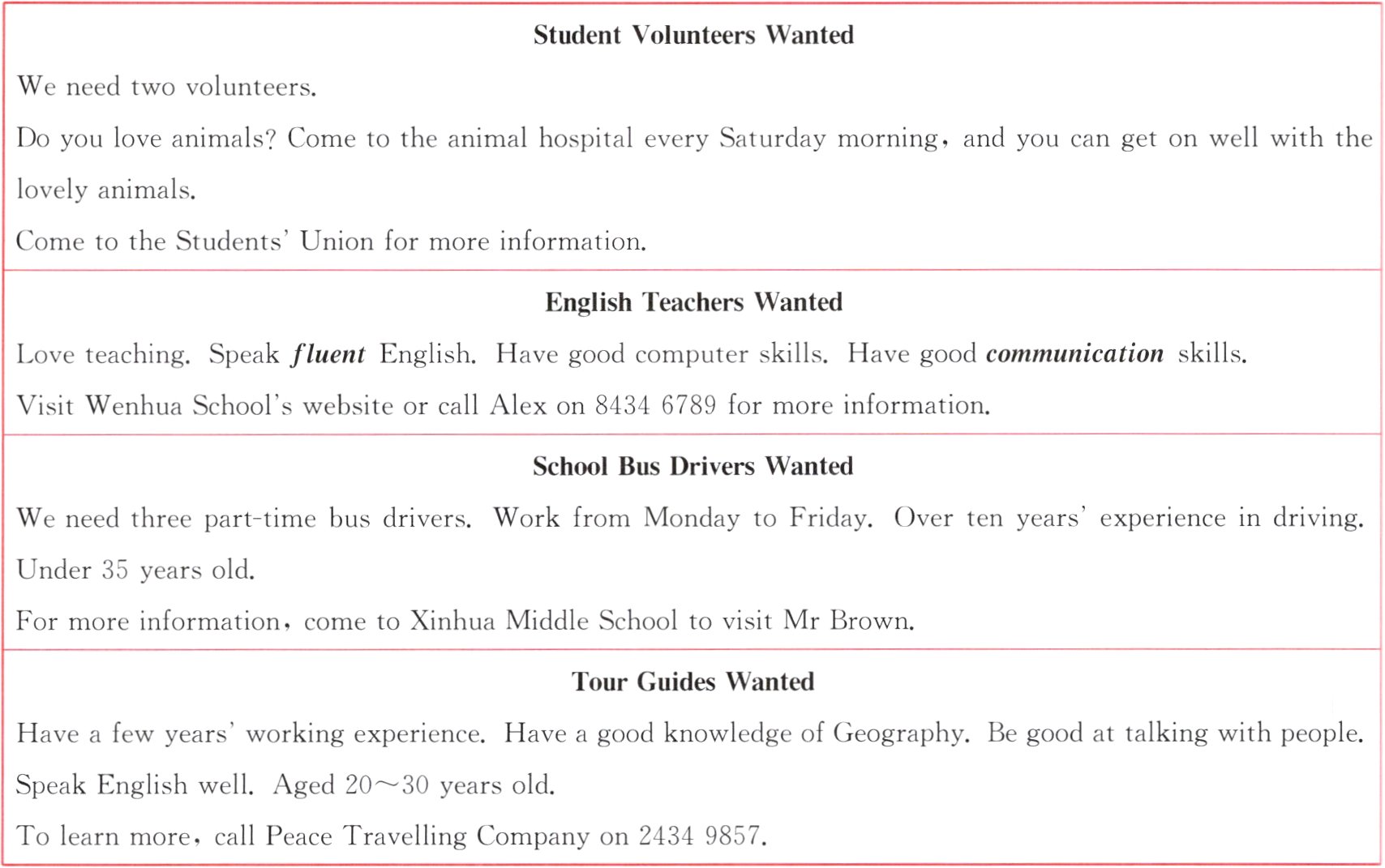 范畴:人与社会 主题:招聘信息 体裁:应用文 难度:★★★ 建议用时:7分钟 评价:____/5