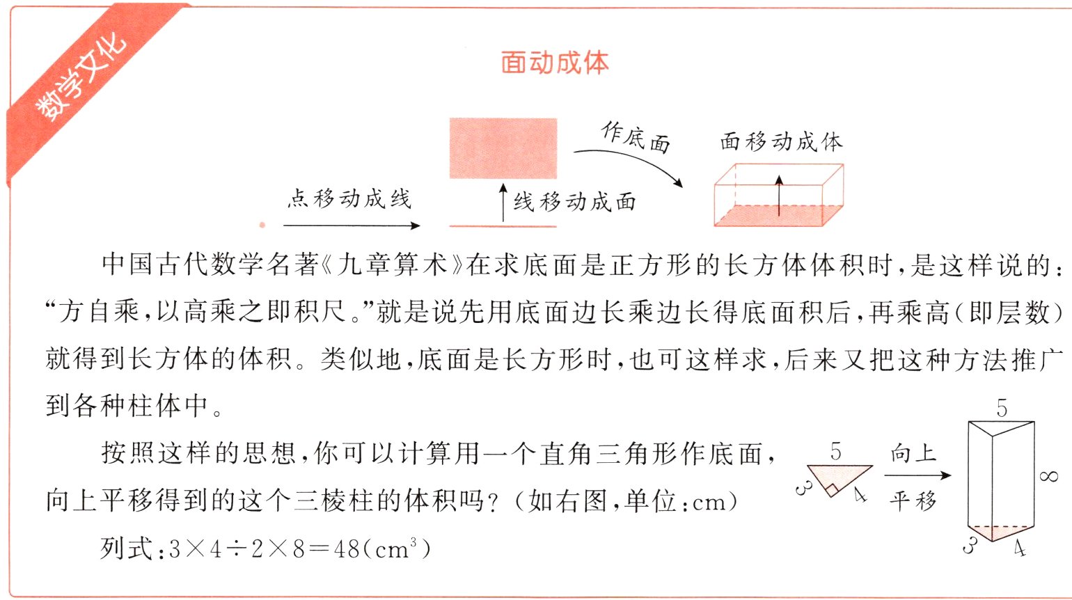 按照这样的思想,你可以计算用一个直角三角形作底面,向上平移得到的这个三棱柱的体积吗?(如右图,单位:cm)