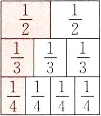 (2)观察右面的分数墙,3个$\frac{1}{4}$组成( );( )个$\frac{1}{3}$组成1;1个$\frac{1}{2}$与( )个$\frac{1}{4}$相等。继续想一想:$\frac{8}{15}$由8个( )组成,1里面有13个$\frac{1}{( )}$。