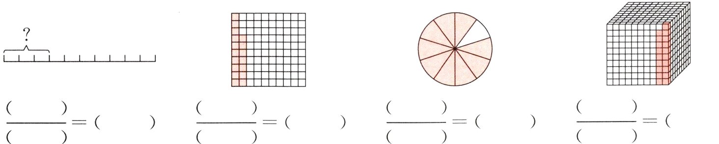 1. 分别用分数和小数表示下面各图中“?"或涂色部分的大小。