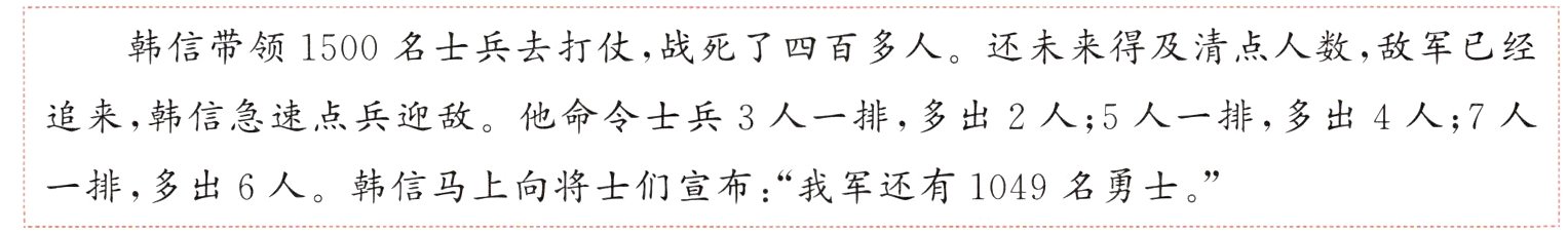 韩信带领1500名士兵去打仗,战死了四百多人。还未来得及清点人数,敌军已经追来,韩信急速点兵迎敌。他命令士兵3人一排,多出2人;5人一排,多出4人;7人一排,多出6人。韩信马上向将士们宣布:“我军还有1049名勇士。”