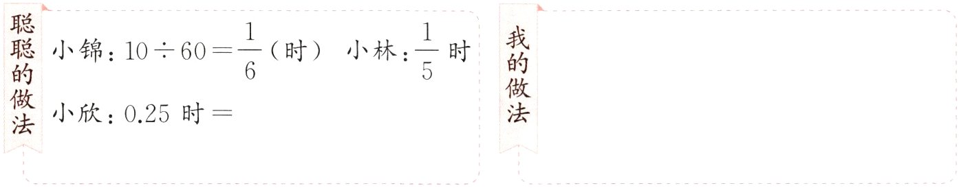 聪聪的做法 小锦:$10\div60=\frac{1}{6}$(时) 小林:$\frac{1}{5}$时 小欣:0.25时 =