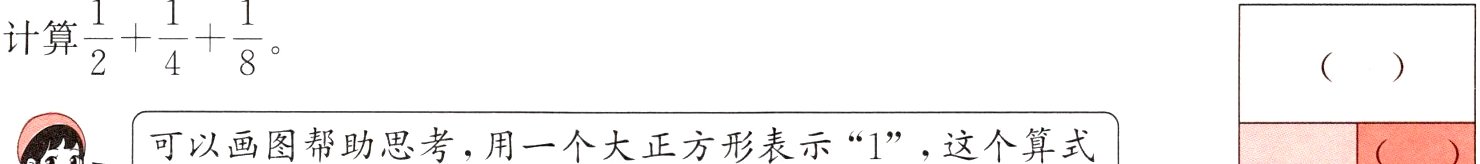 观察上图,涂色面积等于三部分面积之和,还等于“大正方形面积一空白面积”,而空白面积占大正方形面积的( ),可以发现$\frac{1}{2}+\frac{1}{4}+\frac{1}{8}=1−$ ( )$=$( )。