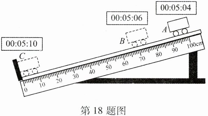 18. (6 分)某物理兴趣小组利用带有刻度尺的斜面、小车和数字钟表“测量小车的平均速度”,如图所示。图中显示的是他们测量过程中小车在 A、B、C 三个位置及其对应时间的情形,显示时间的格式是“时:分:秒”。请你根据图示回答下列问题: