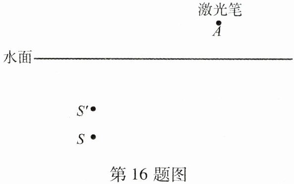 16. 如图所示,小丽看到水中$S'$处有一条鱼,而 S 才是鱼的真实的位置,现要利用激光笔从 A 点发出一束光照射到 S 上,请你在图中完成光路。