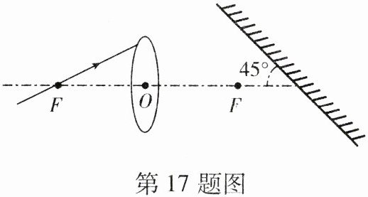 17. 如图一条光线经过凸透镜左侧的焦点 F 射向凸透镜,请在图中画出这条光线经凸透镜折射及再经平面镜反射的光路图。