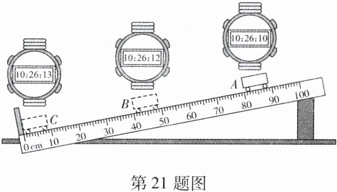21.(8分)某小组在"测小车的平均速度"的实验中,设计了如图所示的实验装置:小车从带刻度(分度值为1cm)的斜面顶端由静止下滑,小车到达A、B、C三处时电子表的显示如图所示。