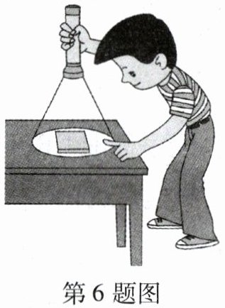6. 晚上, 在桌上铺一张白纸, 把一块小平面镜平放在白纸上, 让手电筒的光正对着平面镜照射, 如图所示, 从侧面看去(
