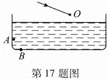 17.如图所示,暗室内有一个容器,容器上方一激光束入射到平面镜(图中未画出)上的O点,光束经平面镜反射后照射到容器壁的A点。现在给容器中装水,水面到如图所示位置,结果发现原来射到A点的光束射到容器底的B点了,请确定平面镜的位置后画出来,并作出激光束从镜面O点反射后,照射到B点的光路图。