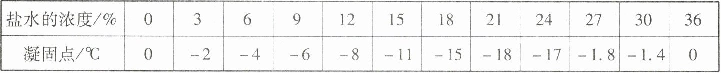分析表格中数据可知,当盐水浓度增大时,其凝固点的变化是