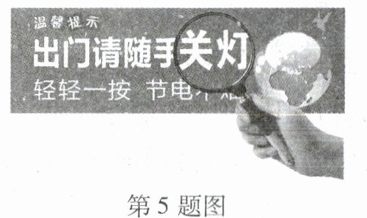5. 小明通过焦距为 8cm 的凸透镜看到了提示牌上“关灯”两字放大的像,如图所示。下列说法正确的是 (