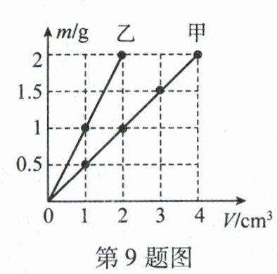 9. 甲、乙两种物质的质量 m 与体积 V 的关系图像如图所示,由图像可知 (