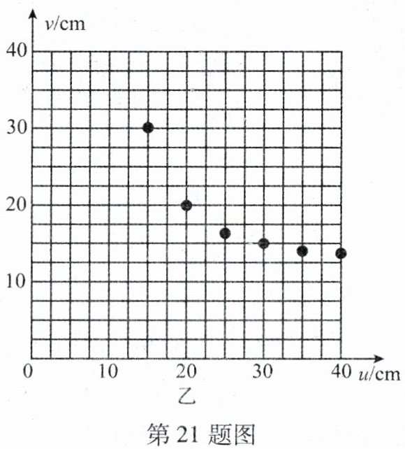 21. (6 分)某同学想探究“凸透镜成实像时,像距与物距的关系”,所用的实验器材有:焦距为 10cm 的凸透镜、光具座、蜡烛、光屏等。