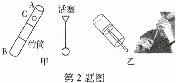 2. 如图甲是小明在活动实践课制作的口哨,由竹筒(A、B 两端开口,C 处开一小口)和“活塞”组成。将活塞从 B 处塞人,在 A 处吹气并来回拉动“活塞”能发出悦耳的哨音,如图乙所示。下列说法正确的是 (