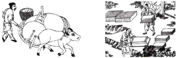 甲:石碾子的质量很大 乙:砖坯堆放在宽木板上