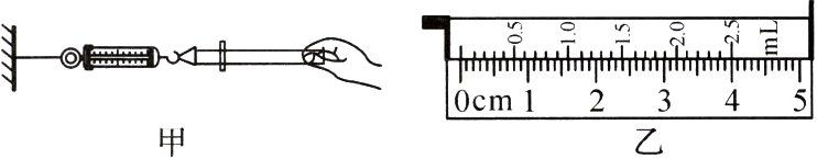 (2)如图甲,用手沿水平方向慢慢地拉动注射器筒,当活塞开始滑动时,此时弹簧测力计示数为6N,用刻度尺测出注射器有刻度部分的长度如图乙所示,则本地大气压强的测量值为______________Pa。