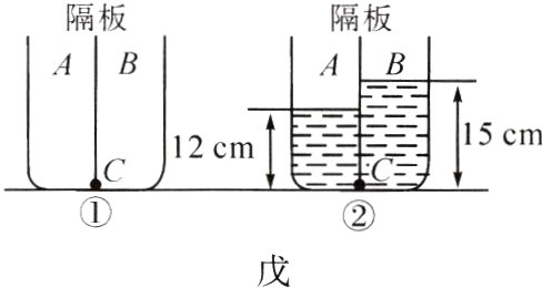 (8)(2024·宜宾)利用如图戊①的实验器材进行拓展实验:容器中间用隔板分成A、B两部分,隔板底部有一小圆孔(用C表示),用薄橡皮膜封闭,橡皮膜两侧压强不同时,其形状会发生改变。如图戊②,当在A中盛水,测得深度为12 cm,在B中盛某种液体,测得深度为15 cm,此时C处橡皮膜形状刚好不改变,则B中液体密度ρ液 = ____________kg/m³。(ρ水 = 1.0×10³ kg/m³)