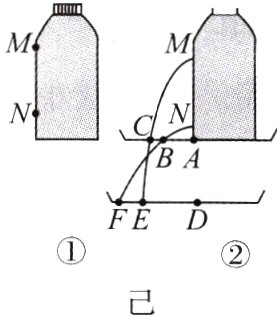 (9)(2024·宿迁)小明利用矿泉水瓶装满水,继续探究,如图己①所示,将瓶盖拧紧,他只将N孔堵住,水从M孔也不能流出,因为水受到了____________的作用。当他拧开瓶盖,放开两小孔,在瓶底部水平放置接水盘,发现水的落点为图己②所示的B、C,于是他将接水盘向下平移至D处,使MA = ND,水的落点为E、F。为了比较两小孔处液体压强大小,应比较AC与________的距离。