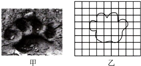 10.新考向 物理观念(2024·北京)生物学家为了估算某只野生东北虎的质量,在足够深的雪地上,选取该东北虎四脚着地停留时的脚印,其中的一个脚印如图甲所示。在方格纸上描绘出脚印的轮廓,如图乙所示,图中每个小方格的面积均为9$cm^2$,数出该轮廓所围小方格的个数(凡大于半格的都算一个格,小于半格的都不算),乘以一个小方格的面积,就大致得出了脚印的面积。在脚印旁边相同的雪地上放一底面积为100$cm^2$的平底容器,在容器中缓缓放入适当的物体,当容器下陷的深度与脚印的深度相同时,测出容器及内部物体的总质量为30kg。忽略脚趾和脚掌之间空隙的面积,g取10N/kg,求: