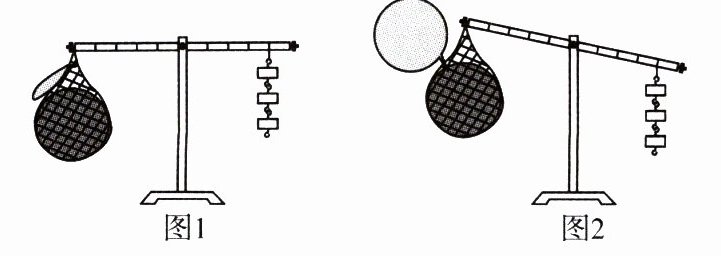 2. 如图1所示,有一个水平平衡的轻质杠杆,其左端挂有充足气的篮球和套扎在气针尾端的气球,右端挂钩码。现将气针头插入篮球中,气球膨胀,此时杠杆如图2所示。则左端所挂物体的重力__________(填“变大”“变小”或“不变”),此实验能说明:____________________。