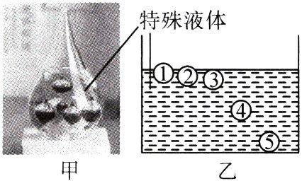 13. 新考向 日常生活(双选)(2024·北京)图甲为一彩球“温度计”,其密闭玻璃容器内装有一种特殊液体,随着温度升高,这种液体的密度会减小。液体中有5个挂有温度标牌的彩球,彩球体积(包括标牌)相等,其热胀冷缩可以忽略。当有彩球悬浮时,悬浮的彩球标牌上的温度值就是所测得的当前环境温度。图乙为这个温度计的示意图,编号为4的彩球标牌所标温度值为22℃,相邻编号的彩球标牌上的温度值间隔为2℃。下列说法正确的是 ( )
