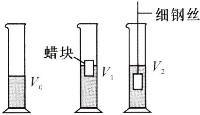 11.(2024·郑州二模)小亮利用细钢丝、量筒和适量的水测量一个小蜡块的密度。小亮的测量过程如图所示,图中$V_{0}$、$V_{1}$、$V_{2}$分别是量筒中水面所对应的示数,细钢丝浸入水中的体积忽略不计。已知水的密度为$\rho_{水}$,则小蜡块密度$\rho_{蜡}$的表达式正确的是 ( )