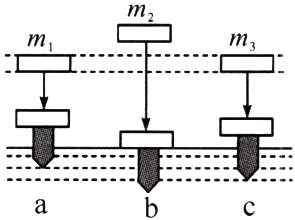 6. 用“模拟打桩”实验来探究物体重力势能的大小与哪些因素有关,物体的质量m1=m2<m3。实验时,让物体从木桩正上方的某一高度处自由下落,将木桩打入沙中,三次实验木桩进入沙中的深度如图所示,木桩进入沙中的深度越深,则物体对木桩做的功越______。比较a、b可知:物体重力势能的大小与物体的__________有关。比较______可知:物体重力势能的大小与物体的质量有关。