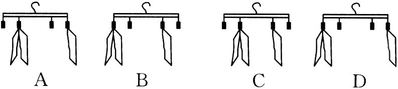 6. 丹丹要晾晒三条相同的湿毛巾,如图的挂法中,最有可能让衣架保持水平平衡的是( )