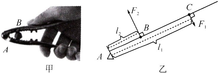 2.(2024·安徽)如图甲所示,用核桃钳夹核桃时,用力握紧手柄即可夹碎核桃。将上部的手柄$ABC$简化为如图乙所示的杠杆,若$F_1 = 20\ N$,$l_1 = 10\ cm$,$l_2 = 4\ cm$,忽略杠杆自身的重力,则$F_2$的大小为______N。