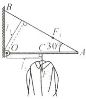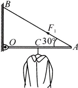 12. 如图所示是一款轻质悬挂式晾衣杆,$OA$为晾衣杆,$AB$为悬线,在拉力$F_1$作用下,晾衣杆保持水平平衡。已知$OA = 1\ m$,$OC = 0.5\ m$,在$C$点悬挂的衣物质量为2 kg。求:($g$取10 N/kg)
