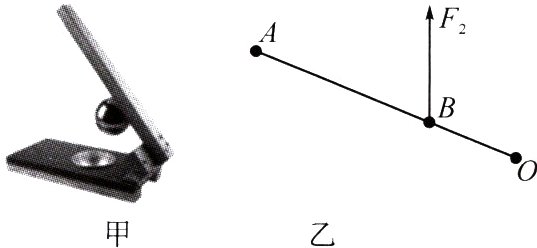 2.(2024·广元)图甲是压制饺子皮的“神器”,压皮时压杆可视为一个杠杆,图乙是简化示意图,图中O为支点,$F_{2}$为压饺子皮时作用在B点的阻力。请在图乙中画出压饺子皮时作用在A点的最小动力$F_{1}$及阻力$F_{2}$的力臂$l_{2}$。