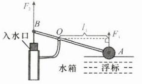 2.如图所示是一种抽水马桶水箱自动上水装置的示意图。当水箱内的水达到一定高度时,浮标带动杠杆AOB压住入水口,停止上水。请在图中画出动力$F_{1}$、阻力$F_{2}$的示意图和动力臂$l_{1}$。