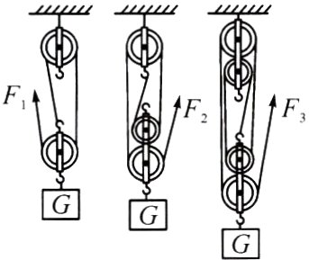 3. 如图所示表示三种不同的滑轮组,用它们提起重为G的相同重物,在绳子自由端所用的拉力分别为F₁ = ________;F₂ = ________;F₃ = ________。(不计滑轮本身的重、绳重和绳与滑轮之间的摩擦)