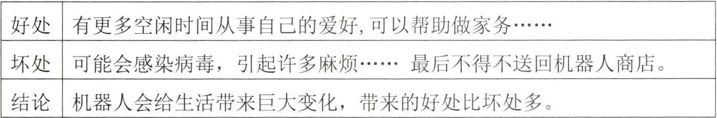 上个星期你们学校去阳光镇参观了“国际机器人展”之后,你对机器人有了更多的了解。请你根据表格信息写一篇短文,谈谈机器人将对你的生活带来的变化。