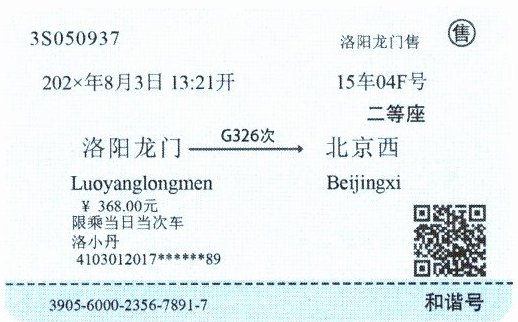 十、新形式·车票 Luo Xiaodan和父母去了北京。根据短文内容和她的车票信息,完成下列任务。(10分)