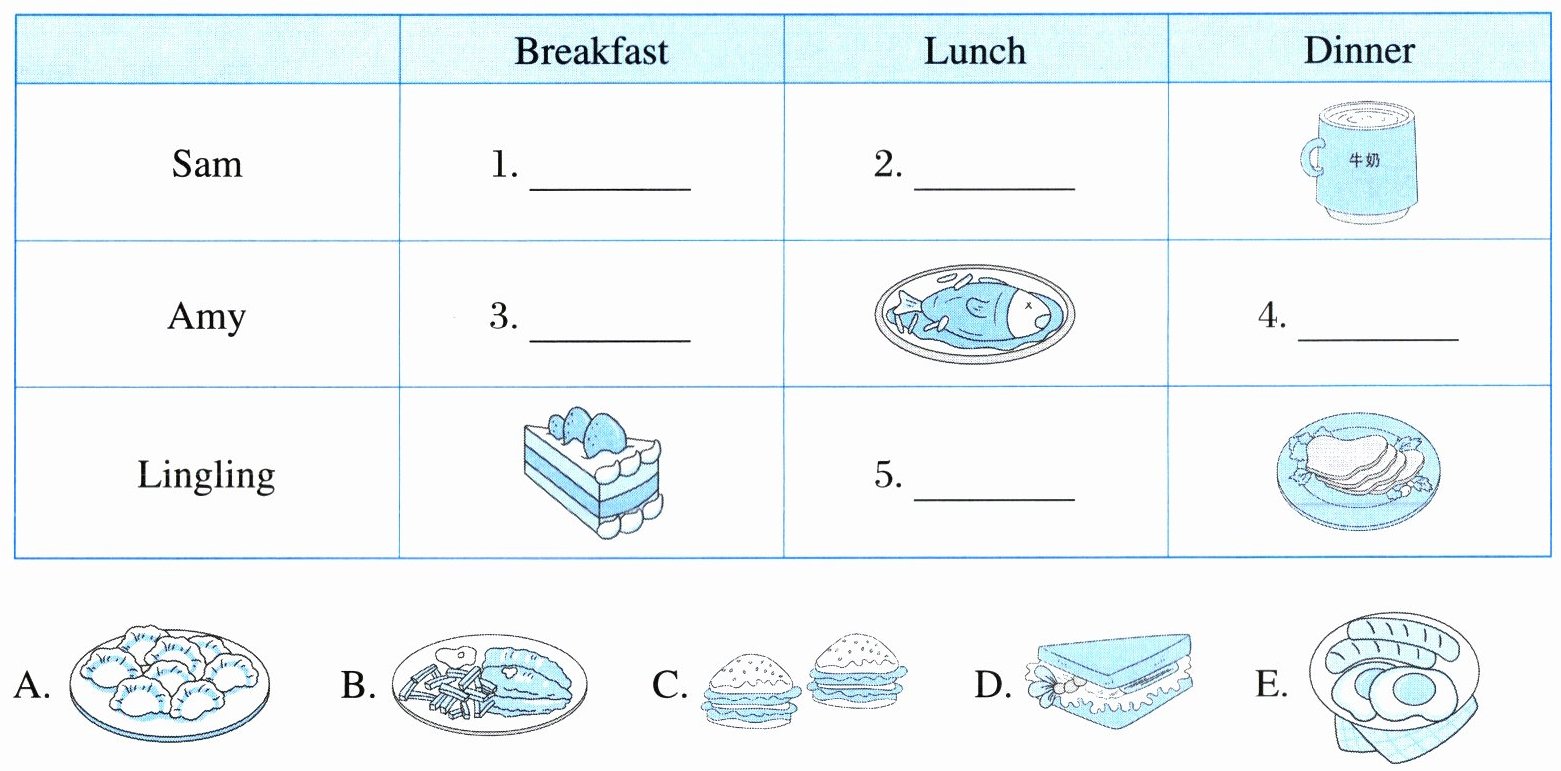 五、(山东省德州市)Ms Smart在统计同学们昨天的饮食。听对话,选择合适的图片,将序号填到表格内相应的横线上。(15分)
