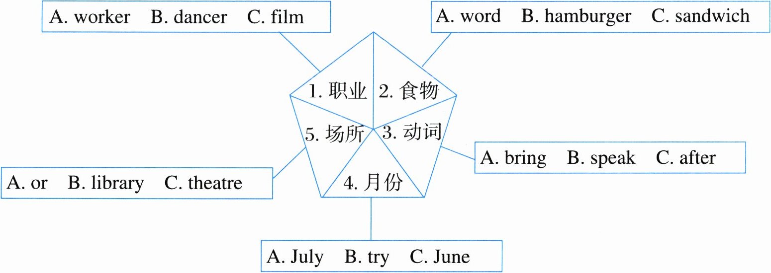 五、根据提示,圈出每组单词中不属于该类的一项。(圈序号)(5分)