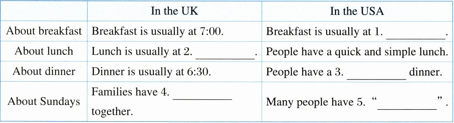 In the UK, people usually have breakfast at 7 o'clock. Lunch is usually at half past twelve. Dinner is usually at half past six. Sundays are special in the UK. Families have lunch together. They eat chicken, potatoes and other vegetables.