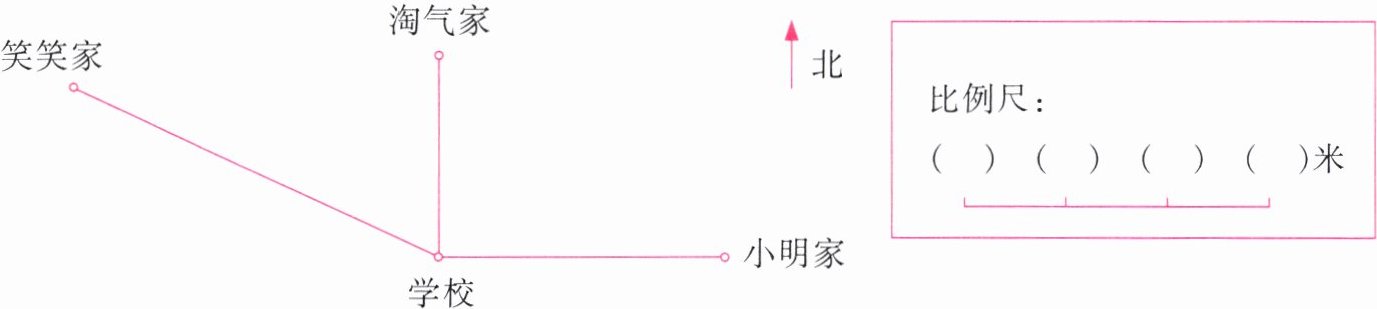 (2) 学校到小明家的图上距离是( )厘米,实际距离是( )米。
