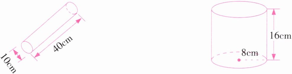 $3.14×(\frac{10}{2})^2×40 = 3140(cm^3)$ $3.14×8^2×16 = 3215.36(cm^3)$