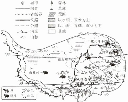 [2024山东临沂一模]当前手机成为“新农具”,直播带货成为“新农活”,卓玛通过“直播带货”助推藏货出藏。下图示意青藏地区主要农作物分布。据此完成5~7题。