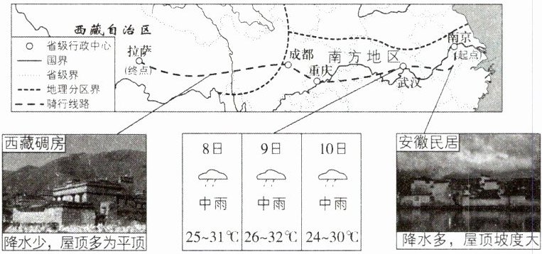 (2)读图可知,小华骑行的起点南京以及途经的武汉、重庆、成都均为南方地区,到达的终点拉萨为青藏地区,故途经南方地区和青藏地区。读图可知,西藏降水少,碉房屋顶多平顶;安徽降水多,民居屋顶坡度大,便于排水,说明安徽民居与西藏碉房屋顶坡度差异显著的主要影响因素是降水。