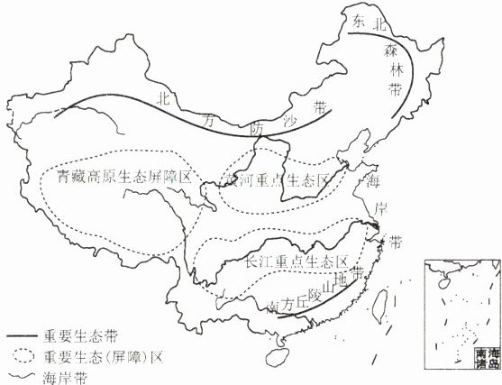 [2024山东滨州中考]为建设美丽中国,守住自然生态安全边界,“十四五”时期我国提出“三区四带”重点区域生态屏障建设。读“重要生态系统保护和修复布局示意图”,完成1~3题。