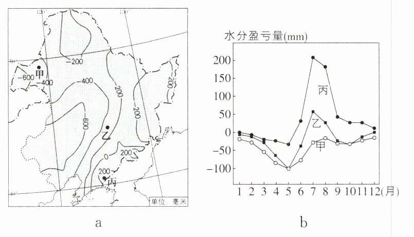 一个地方的降水量和它的蒸发量(在一定气象条件下,水分供应不受限制时,某一固定大气与其下界的地面或水面的分界线的最大可能蒸发量)的差值,称为水分盈亏量。如下图,图a示意我国东北地区多年平均水分盈亏量的空间分布,图b示意甲、乙、丙三地水分盈亏量的月份分配。