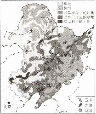 (1)东北地区是我国重要的商品粮基地,该地区气候以温带季风气候为主,耕地多分布在平原,耕地类型以旱地为主,主要农作物有春小麦、甜菜、玉米等。