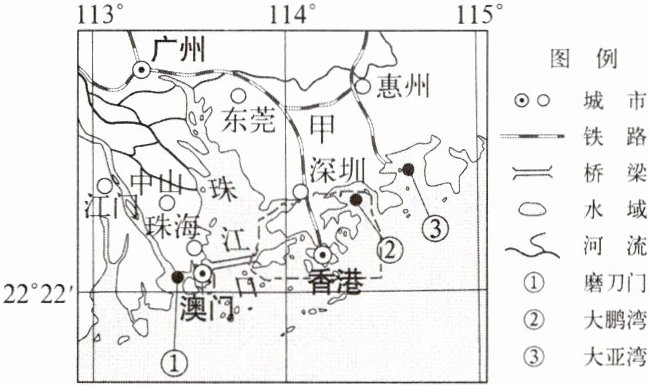 [2023河北承德期中]港珠澳大桥是中国境内一座连接中国香港、广东珠海和中国澳门的桥隧工程,因其超大的建筑规模、空前的施工难度以及顶尖的建造技术而闻名世界。结合下图,完成2~3题。